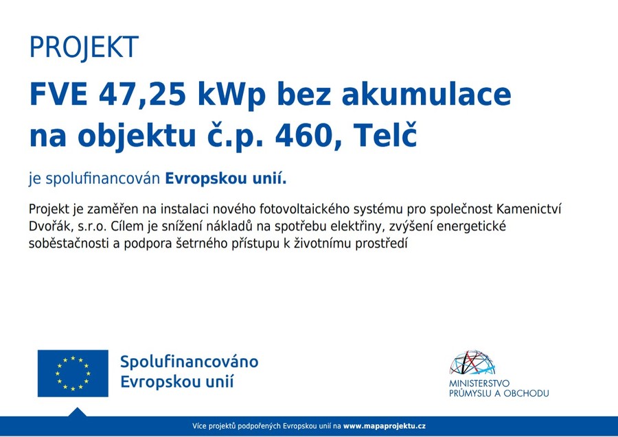 Za finanční podpory programu spolufinancování z Evropské unie jsme realizovali fotovoltaický systém o výkonu 47,25 kWp na budově č.p. 460 v sídle a areálu naší společnosti Kamenictví Dvořák s.r.o. v Telči.
